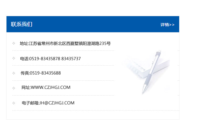 傳真:0519-83435688    郵編:213135    網址:WWW.czjhgj_com.ccbaochang.com    電子郵箱:JH@czjhgj_com.ccbaochang.com